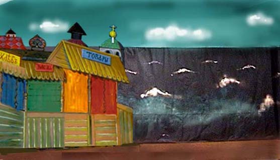 Rear curtain and stage set from the children's play in Parochial School of the Russian Orthodox Holy Virgin Protection Church at Nyack, NY Задний занавес и декарация для спектакля "Конек-Горбунок" в Церковно - Приходской школе храма Покрова Пресвятой Богородицы в Наяке 2003 г. |